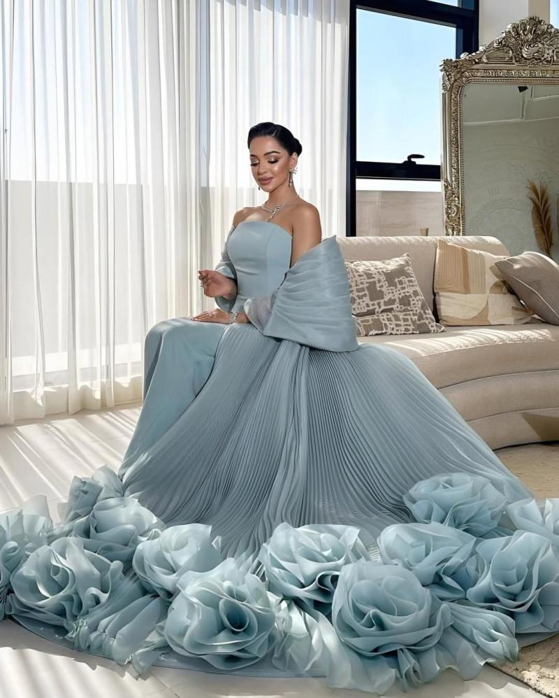 انغمسي في سحر الأناقة والجمال مع فستان السهرة الأزرق السماوي بتصميم الورود الفاخر، تحفة فنية تجسد الرقي والأنوثة في كل تفصيلة.