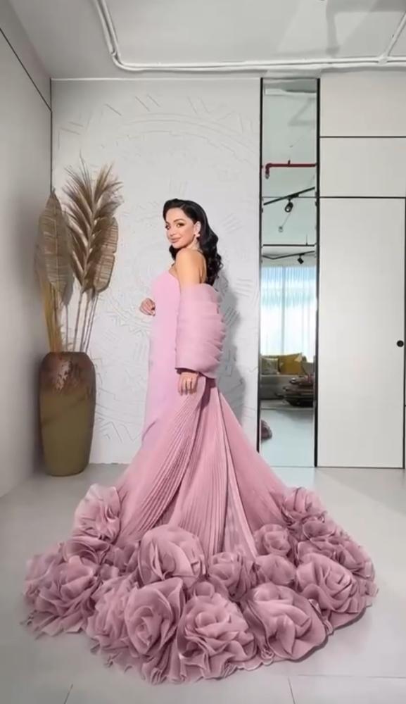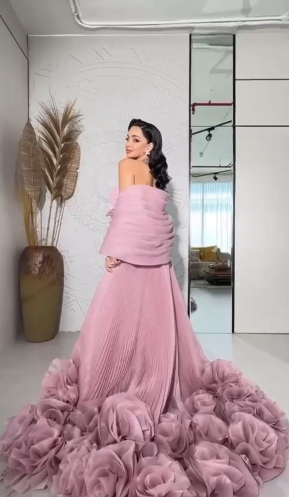 • الورود: تزين الفستان ورود فاخرة مصنوعة يدوياً تضفي لمسة من الرومانسية والجمال.