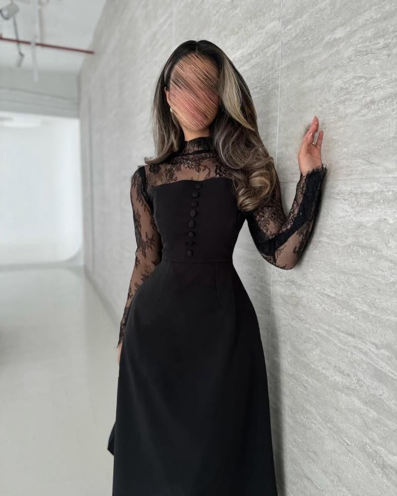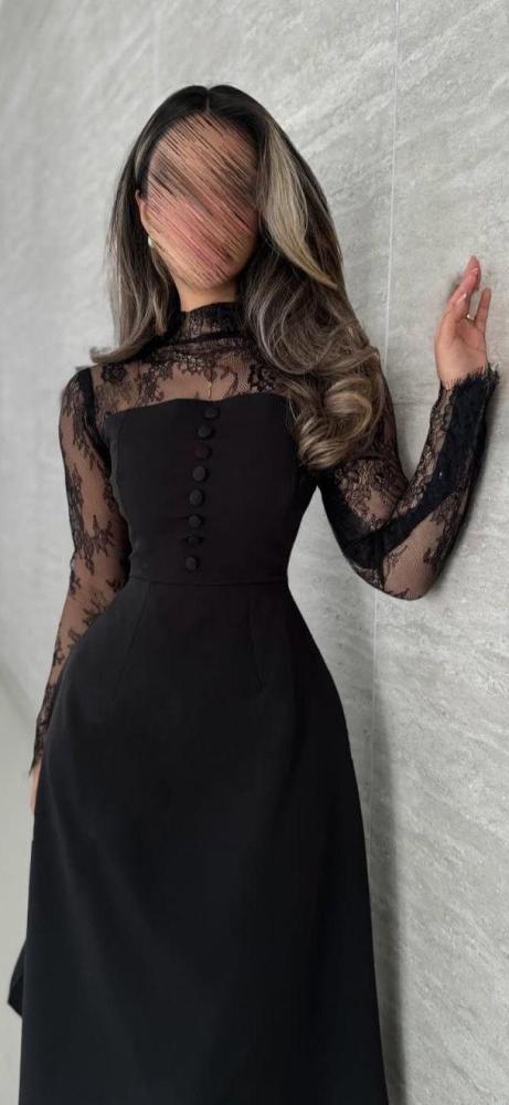 - التصميم: يتميز الفستان بتصميم أنيق ذو أكمام طويلة مصنوعة من الدانتيل الشفاف الذي يضيف لمسة فنية ناعمة وجذابة.
