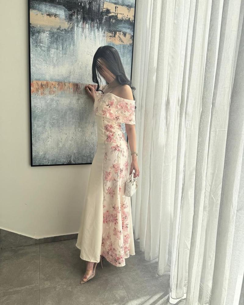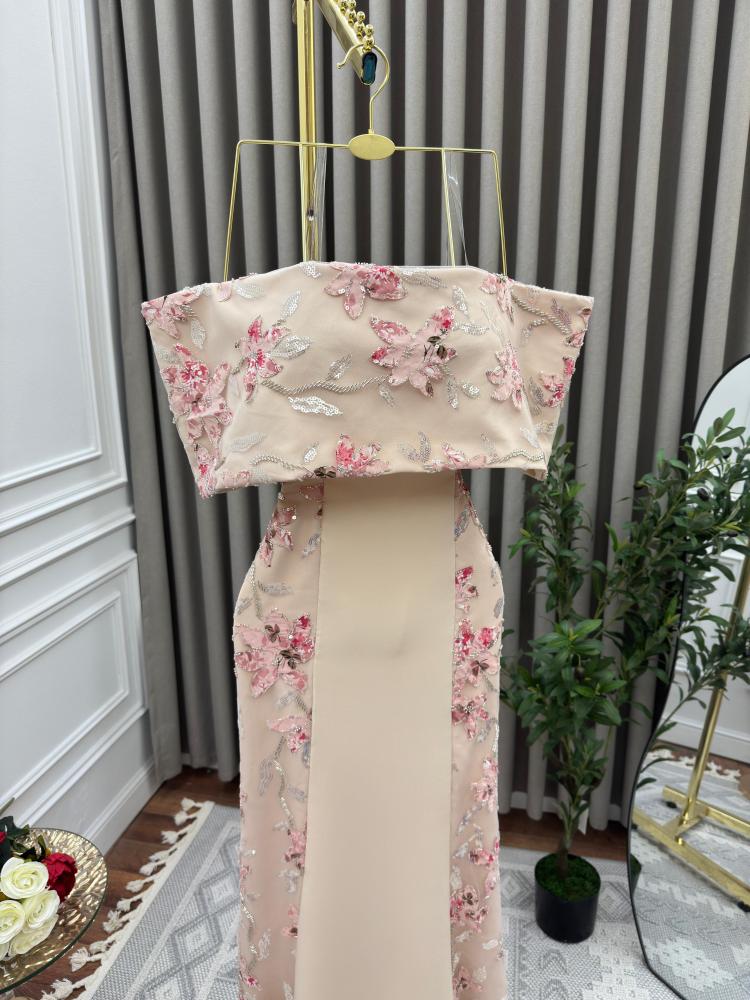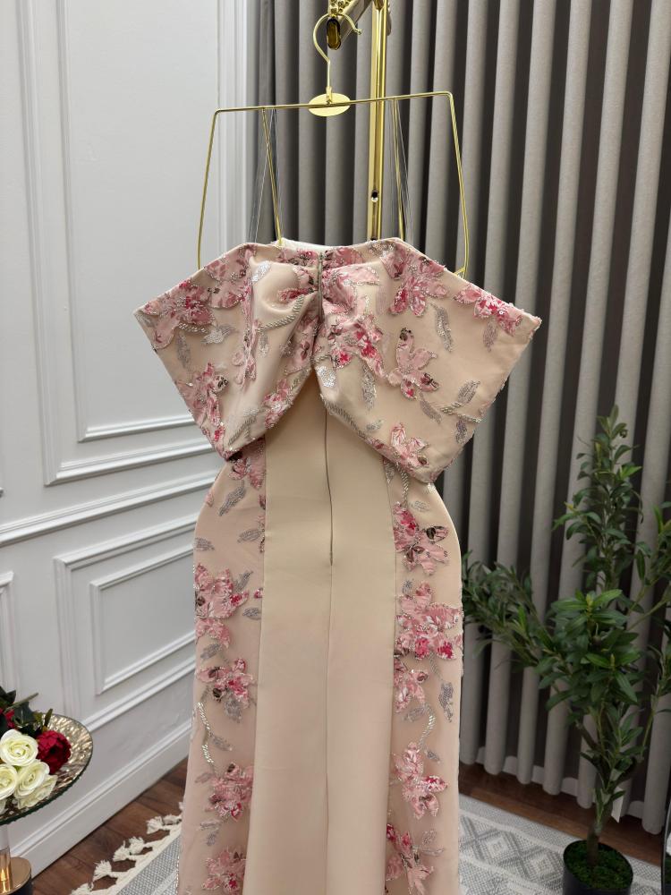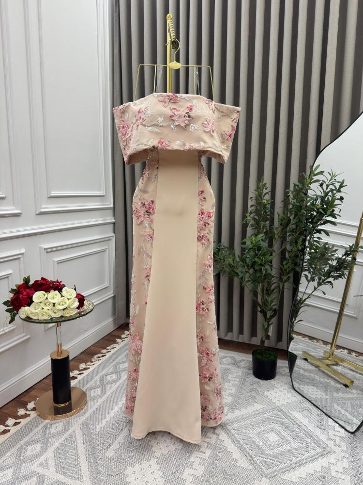 اكتشفي الجمال الساحر مع فستان السهرة الأنيق. يتميز هذا الفستان بتصميمه الأوف شولدر الذي يضفي لمسة من الأنوثة والرقي تجعله اختيارًا مثاليًا للمناسبات الخاصة. القماش ذو النقشات الزهرية الرقيقة يمتد على طول الفستان، متناسقًا بتصميمه ليناسب جميع القوام ويمزج بين الأناقة والكلاسيكية ببراعة.