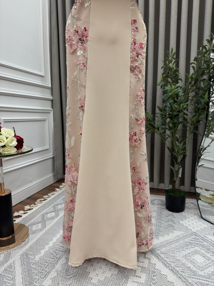 يمتاز الفستان بتصميمه الماكسي الذي يمنحك إطلالة راقية وجذابة، مع فتحة جانبية تساعد على الجلوس والحركة بسهولة وراحة. اللون الكريمي الأساسي يتناغم مع الرسومات الزهرية بالدقة، مما يضيف لمسة من الأنوثة إلى الإطلالة.