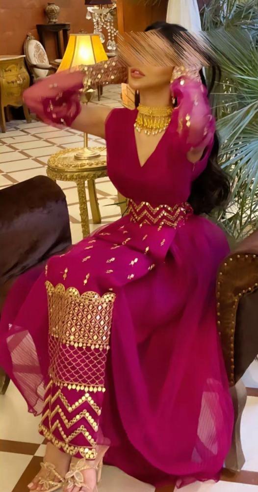 يأتي الفستان بتفاصيل مدهشة، حيث يزين الجزء العلوي تصميمات ذهبية متناغمة بشكل هندسي على خط الخصر، مما يعزز من جمال التصميم ويضيف إليه لمسة شرقية ساحرة. تم تصميم الأكمام الطويلة من مادة شفافة تضيف بعداً آخر من الأناقة، في حين أن الجزء السفلي ينتهي بتفاصيل مزخرفة تنسجم بشكل مثالي مع باقي الفستان.