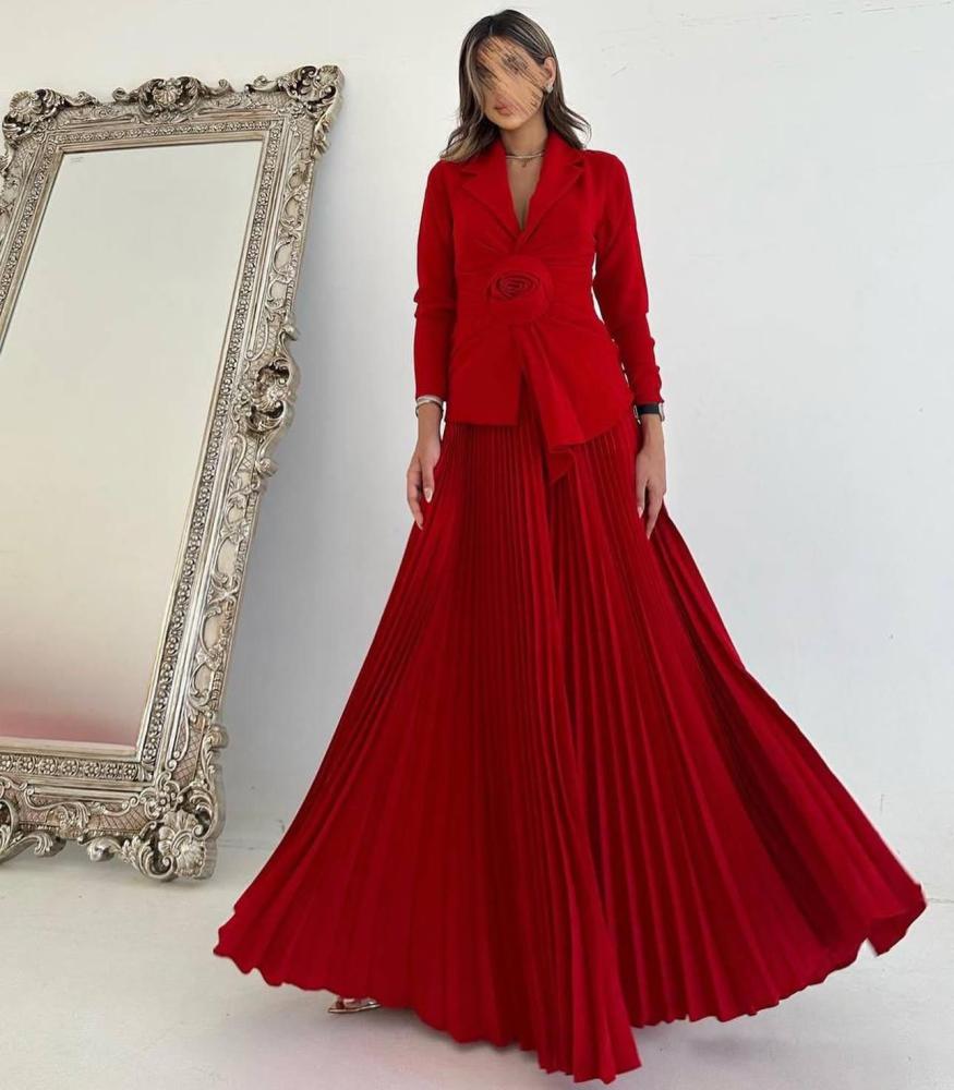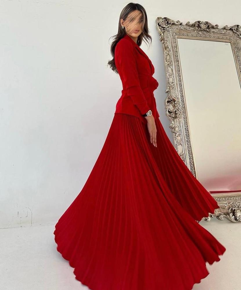 التصميم يشمل جاكيت مصمماً بدقة بحزام أنيق يبرز جمال الخصر، مع أكتاف مهيكلة تضيف لمسة من القوة والجاذبية. التنورة الطويلة المنسدلة بطيّات مميزة توفر حركة سلسة وأناقة لامتناهية، مما يجعل هذا الفستان مناسباً لمختلف المناسبات من السهرات الفاخرة إلى الحفلات الرسمية.