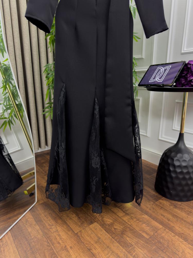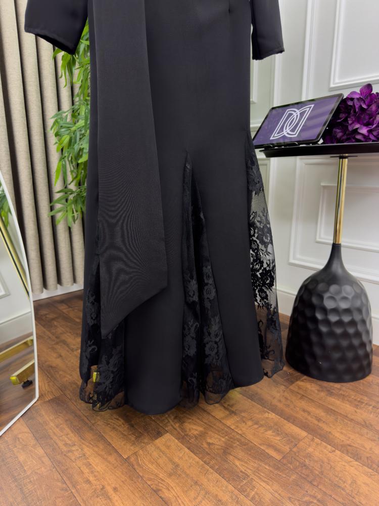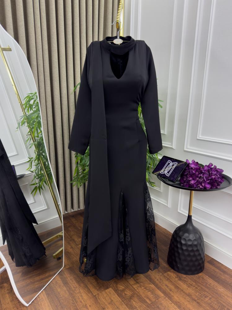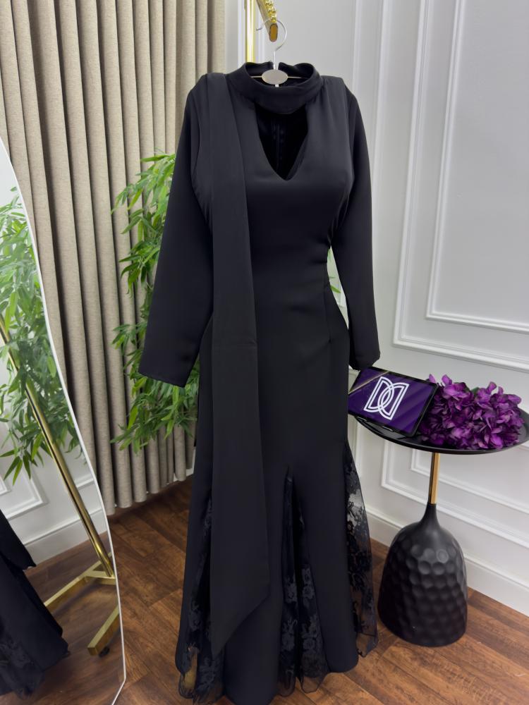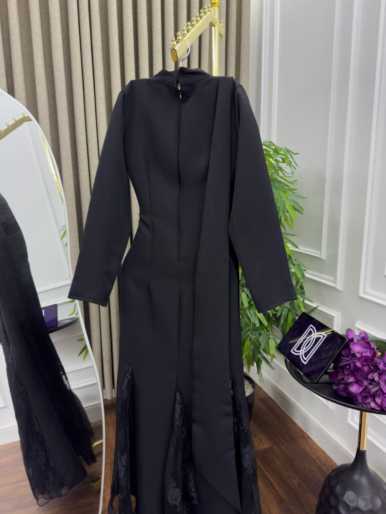 تصميم الفستان يأتي باللون الأسود الكلاسيكي الذي يعزز من جاذبيته، بينما يضيف الطول المتدفق مظهراً أنثوياً فريداً. يتميز الفستان بقصة مميزة مع فتحة رقبة مغلقة بإحكام تضفي جاذبية متوازنة، ويجمع بين البساطة والفخامة بفضل القماش الراقي الشفاف الذي يشكل طبقات الفستان.