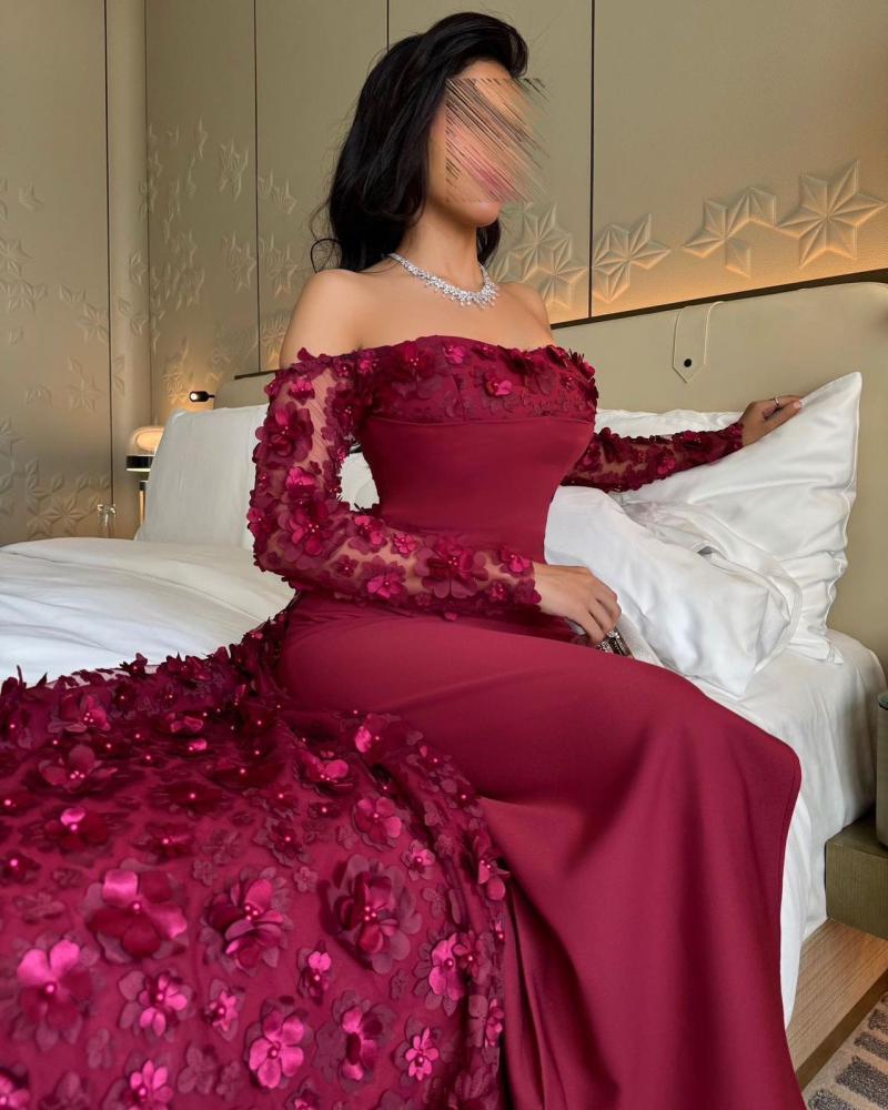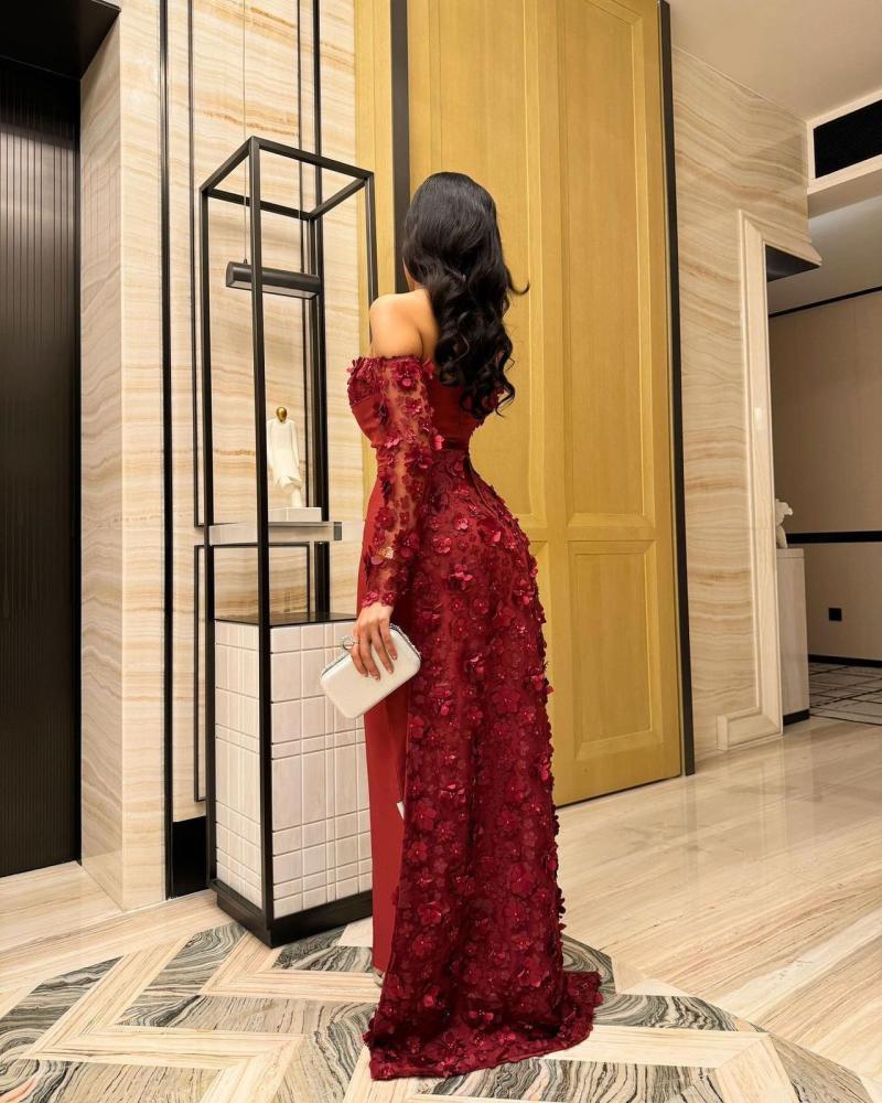 - أكمام طويلة من الدانتيل: تضيف لمسة من السحر والغموض، مع تفاصيل الزهور ثلاثية الأبعاد التي تزيد من فخامة التصميم.