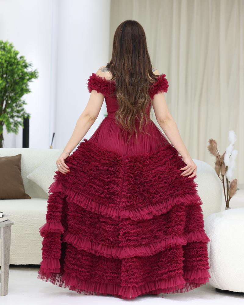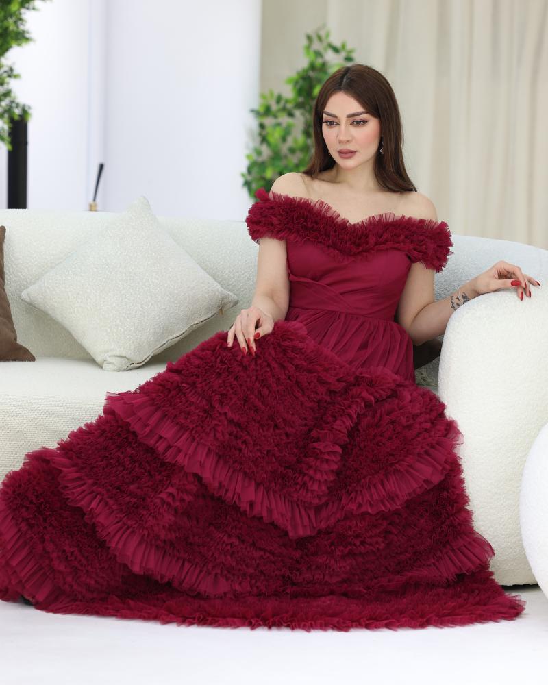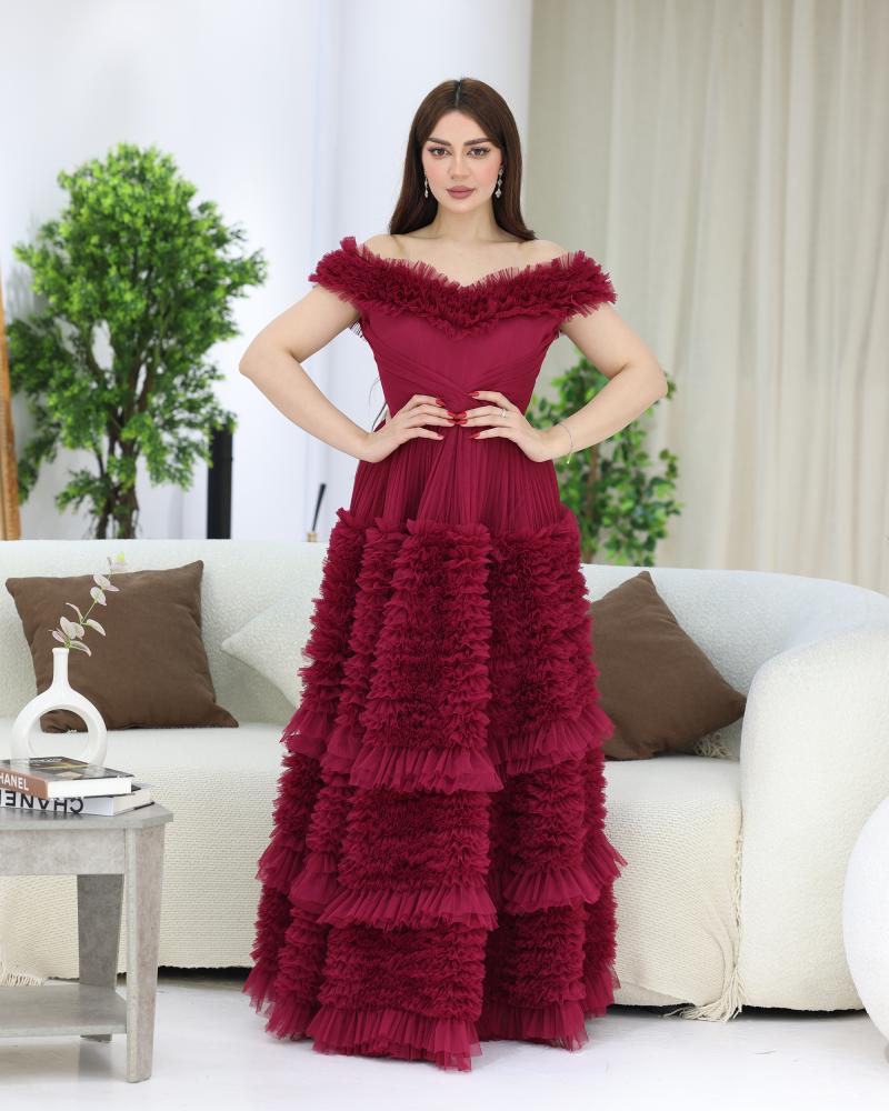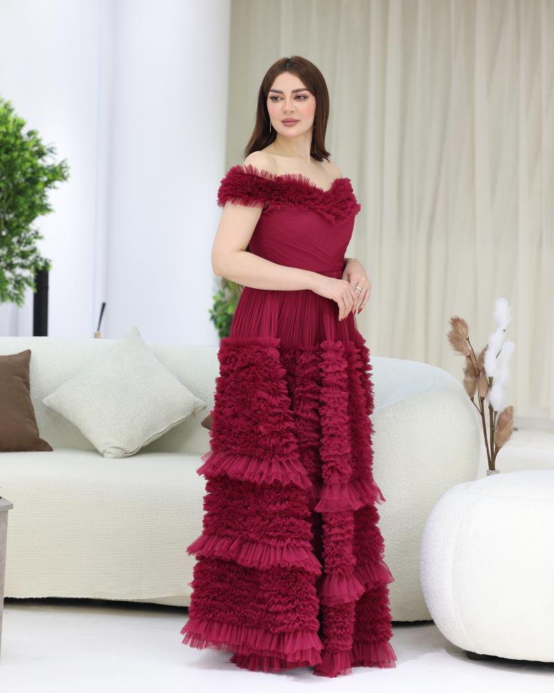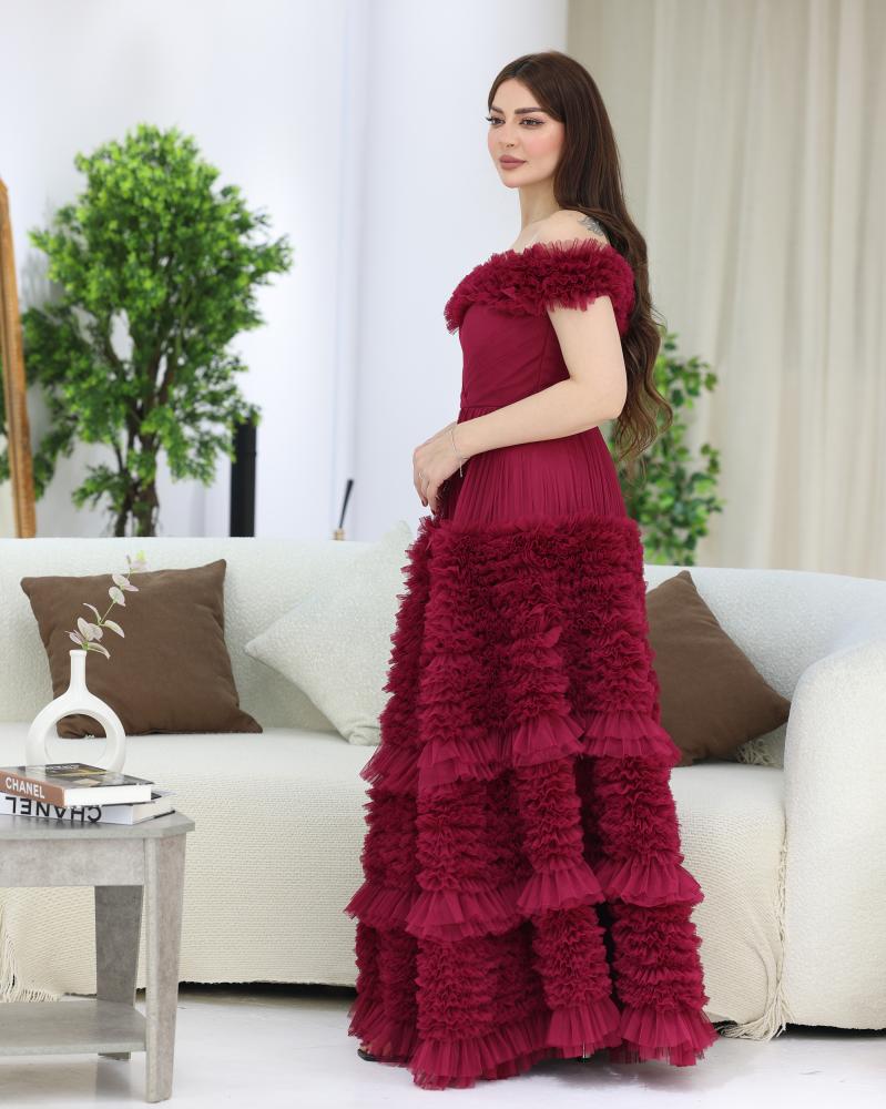 يتميز الفستان بتصميمه الأنيق المنفوش بطبقات من الكشكش التي تضفي حركة ديناميكية وعصرية. يأتي بأكتاف مكشوفة تعزز من جاذبية التصميم وتبرز جمال الكتفين برقي واضح. يضاف إلى ذلك تصميماً ضيقاً من الخصر لينساب بعدها بانسيابية جميلة في تنورته الواسعة والمرتبة بعناية لتضفي عليكِ حضوراً ملفتاً للنظر.