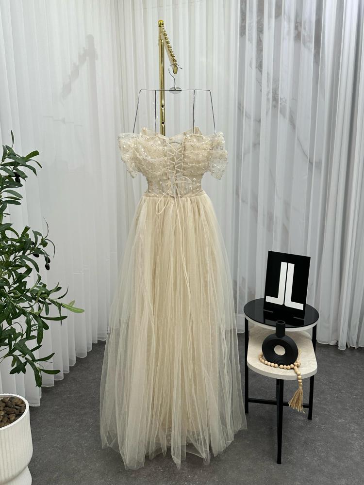 يتميز الفستان بتصميمه الرائع الذي يبرز جمالكِ وأنوثتكِ. الجزء العلوي من الفستان مزين بتطريزات دقيقة تضفي عليه لمسة من الرقي، مع تصميم يظهر الأكتاف بشكل جذاب. أما التنورة، فتنسدل بنعومة لتمنحكِ إطلالة ساحرة وأنيقة.